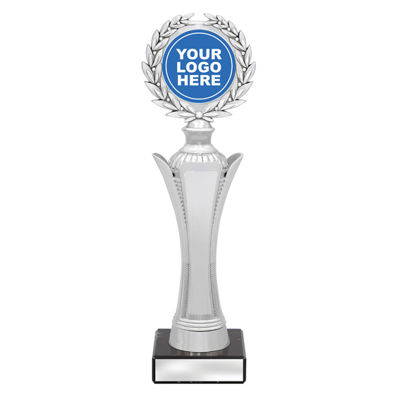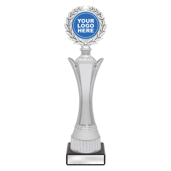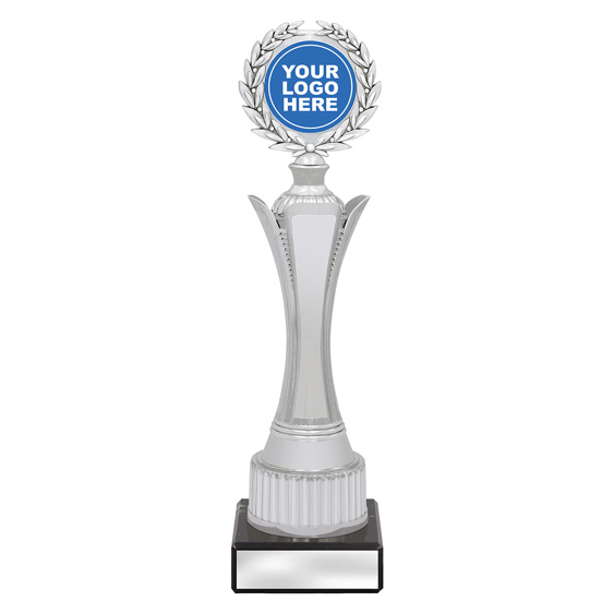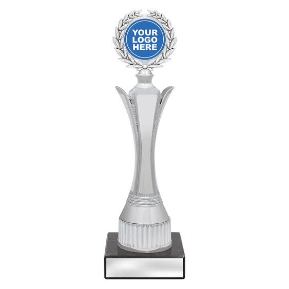Elegant series of holder style trophies to showcase your club or event logo. Designs over multiple sizes with bright silver and black marble for engraving.