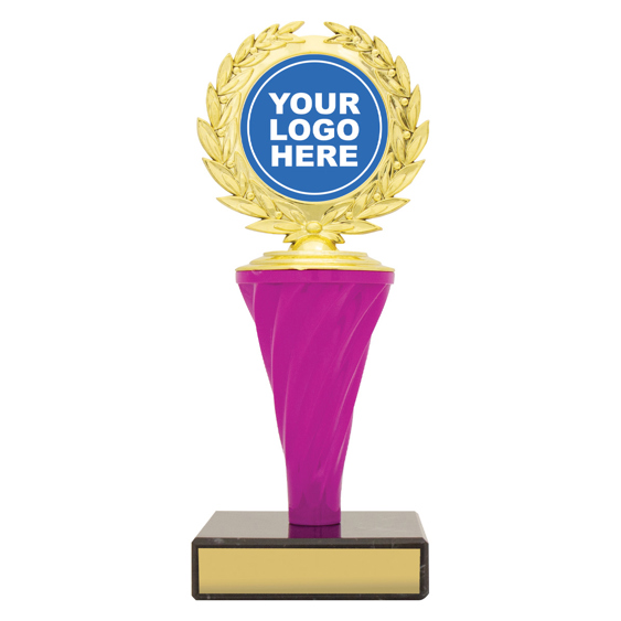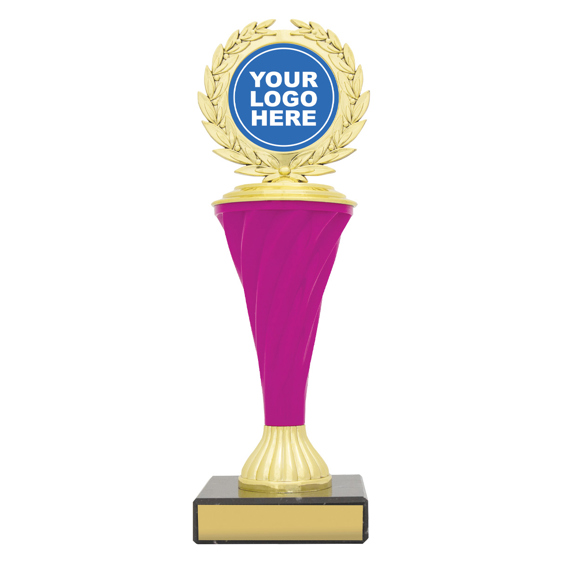 Spiral trophies in blue and pink are perfect to show off the custom logo representing your event or competition.