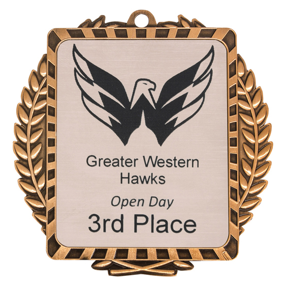 Uniquely designed Wreath Medals in Gold, Silver and Bronze personalised to perfectly suit the nature of your event or tournament. Versatile award with range of ribbons to choose from.