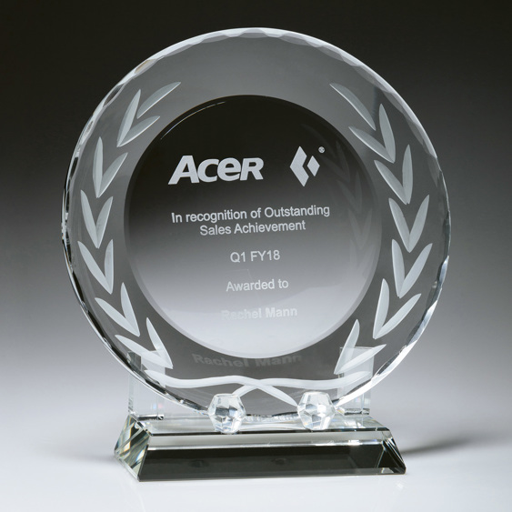 Unique award, the Crystal Tray presents an elegant and prestige trophy option. The crystal tray features faceted edges and pre-decorated wreath pattern. The item is supplied with base and in a presentation gift box.