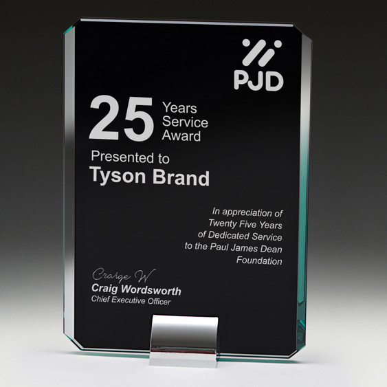 Outstanding glass awards with patented black panels allow for precise engraving to your requirements. Design is elevated by the shiny metal bases. In gift boxes.