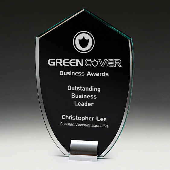 Outstanding glass awards with patented black panels allow for precise engraving to your requirements. Design is elevated by the shiny metal bases. In gift boxes.