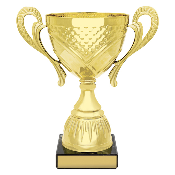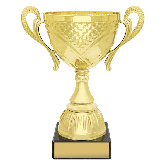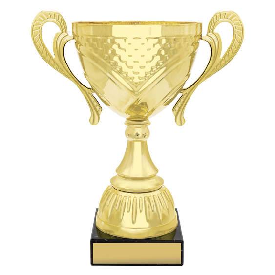 Classic looking series of gold trophy cups feature elegant metal bowls and premium black marble bases.