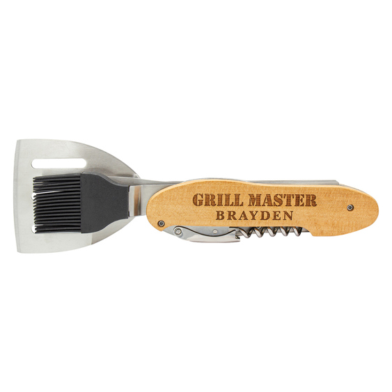 Brilliant engravable gift idea for that special someone who loves their BBQ. The beechwood & stainless steel set includes scrapper, brusher, fork & bottle opener. Presented in own carry bag.