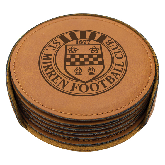 Rawhide set of 6 coasters feature a stylish circle design within tailored holder - personalise with a special message or showcase a custom design or logo.