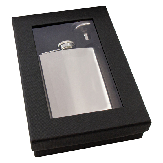 Stainless Steel Flask 6 oz. in a gift set with pourer and presentation gift box with transparent cover. Polished shiny finish. An excellent award or gift idea for your business or sporting club.