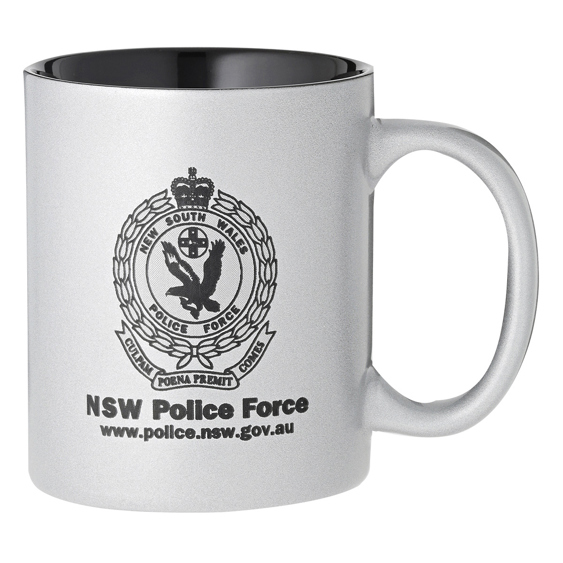 Silver ceramic coffee mug perfect for laser engraving for your text and logo requirements. Standard 325ml design. Silver outer coating and black engraving. A brilliant alternative for an award or trophy for your company or organisation.