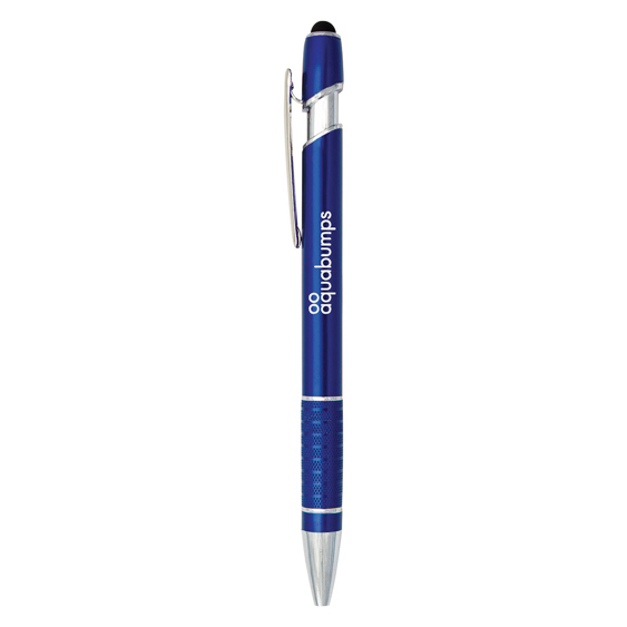 Designer aluminium pen with texture grip and stylus features available in various colours.