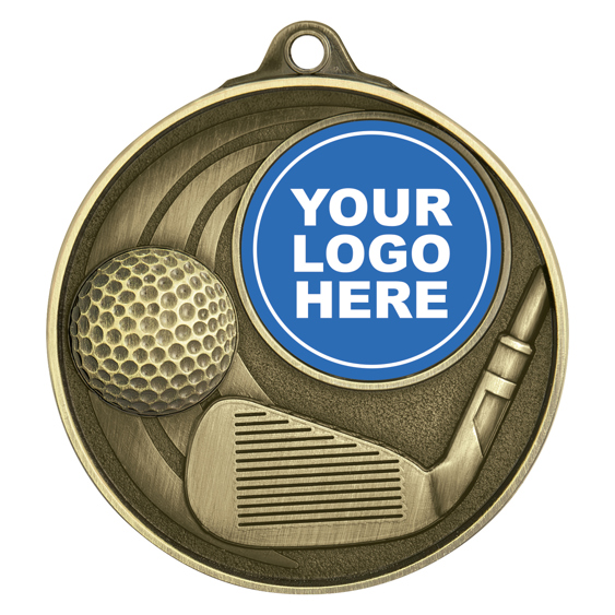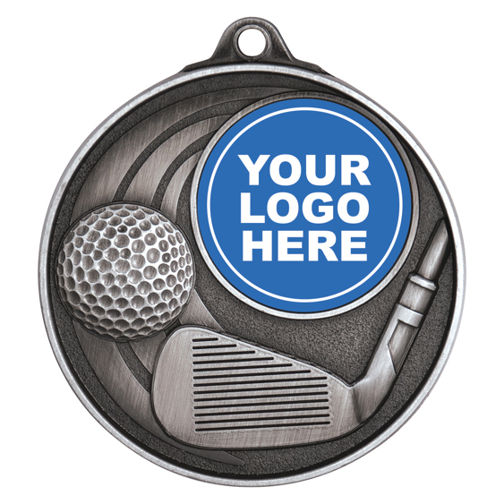 Popular medal design features golf and club elements with space to include your 25mm custom logo. Engraving space on the back of the medal.