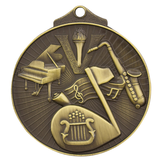 Antique gold, silver and bronze medals for Music. A classic design, the Sunraysia Medals feature iconic and common elements for music including notes and instruments. Medals feature an extra thick edge and a rectangle panel on the back of the medal for your engraving.