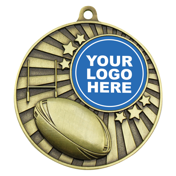 Brilliant medal for Rugby League or Union - features iconic elements of ball and posts while retaining central space for your custom logo to celebrate your club.