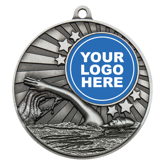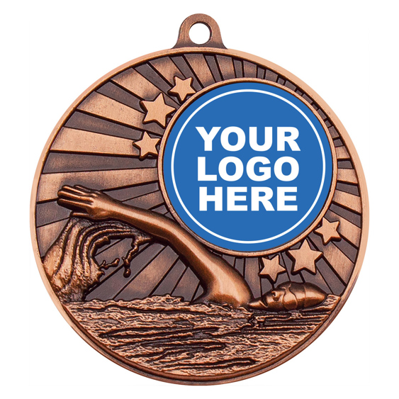 Brilliant swimming medals features iconic scene of swimmer in action while retaining central space for your custom logo to celebrate your club.