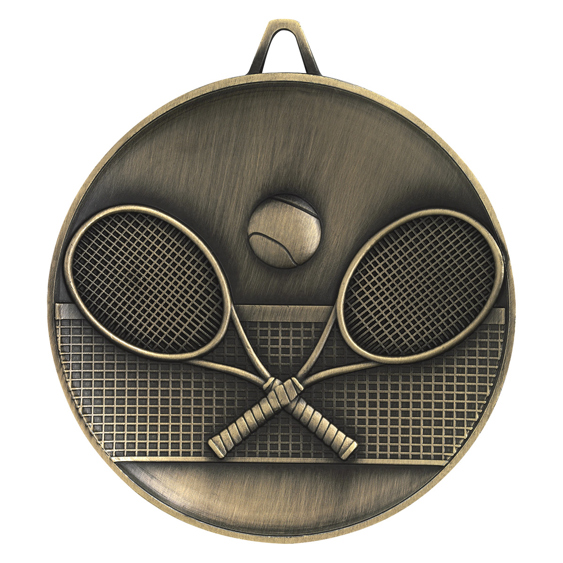 The Budget Heavyweight series offers prestige antique gold medals for a range of sports and activities at great value. The Tennis medal design features a theme of crossed tennis racquets against a net background.