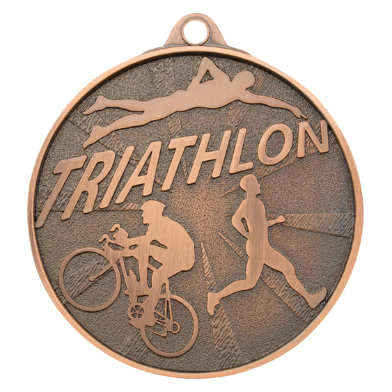 Triathlon medal in gold, silver or bronze. Effective medal design illustrates the range of activities involved in the triathlon. The medals meet budget requirements while still presenting an interesting and appealing design. Ribbons in all colours and medal boxes to suit.