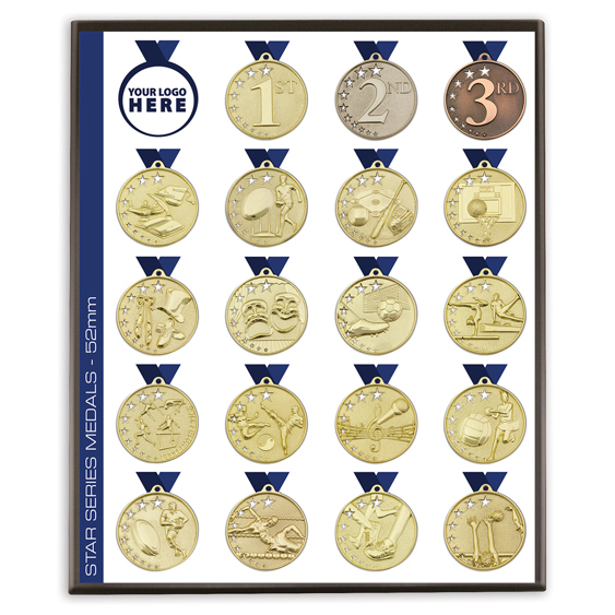 Display boards available featuring popular medal and product series. Enquire about customising any board with your logo.