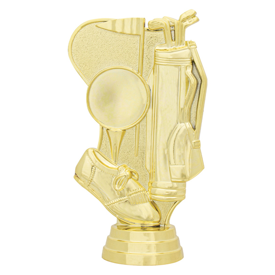 Bright gold trophy top features prominent golfing elements - shoe, bag, tee - a reliable choice when building a traditional style trophy. Plenty of base options available to choose from according to your award requirements. Top is reversible with space for a 25mm insert if required.