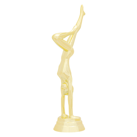 The Female Gymnast finished in bright gold, depicts a participant in an iconic movement and pose. Traditional multi-part trophies popular for the sport of gymnastics. Female and Male top counterparts available.