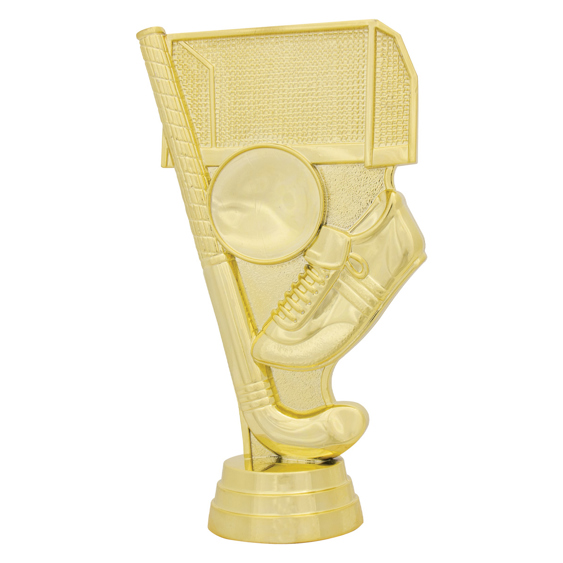 Bright gold trophy top features prominent hockey elements - shoe, stick, goal - a reliable choice when building a traditional style trophy. Plenty of base options available to choose from according to your award requirements. Top is reversible with space for a 25mm insert if required.