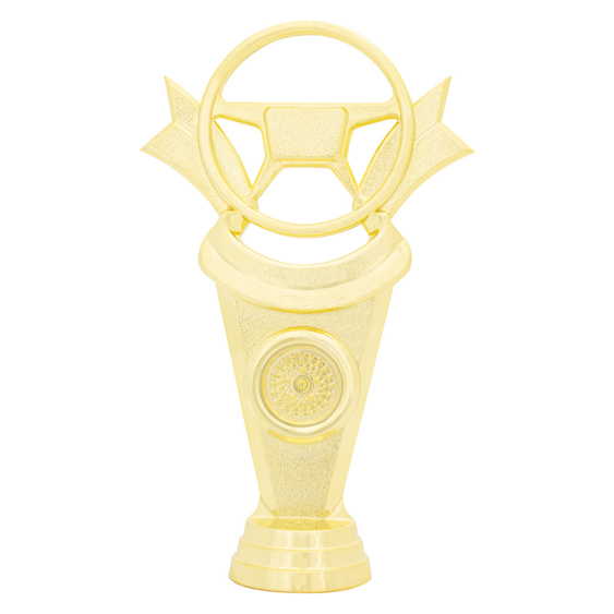 Traditional driver award theme top finished in gold and features auto steering wheel on stylish platform. Useful component when building the multi-part trophies to your specifications.