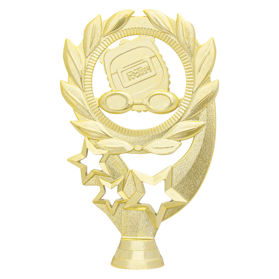 Different tops and figures to suit your design requirements for various Swimming awards. The gold star inspired theme features prominent swim elements - googles and stop-watch against a stylish wreath background. Wide range of bases and riser components to choose from to build your multi-part trophy.
