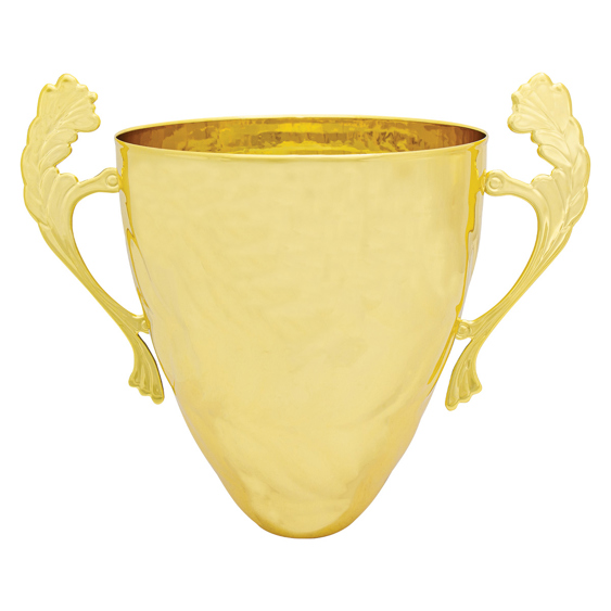 Classic design for metal conical bowl cup with handles and distinctive pattern. Available in gold or silver.