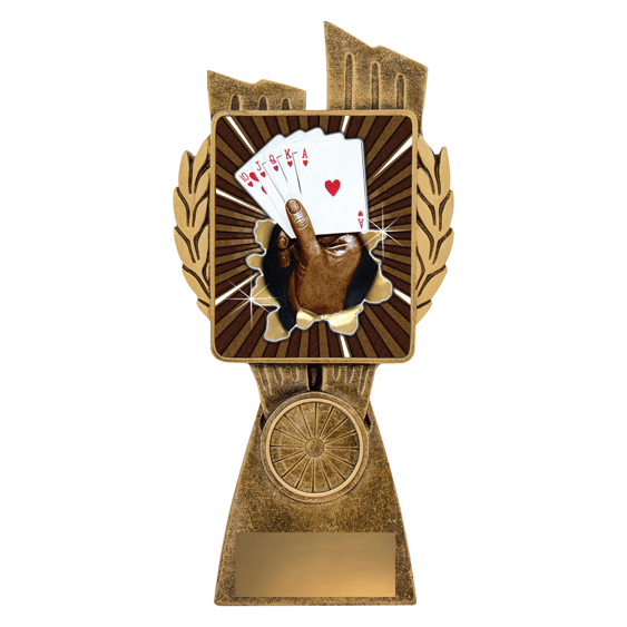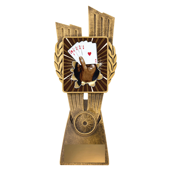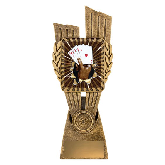 This Antique Gold Lynx Trophy is the perfect theme award for card playing events and activities. Series can be used as a recognition trophy and prize giving to recipients at your event or presentation. Featuring a classic wreath and vibrant design, these Cards trophies are customisable and available in 4 impressive sizes.
