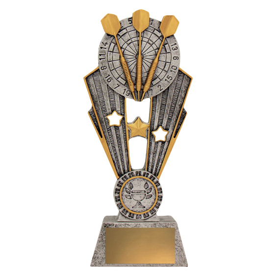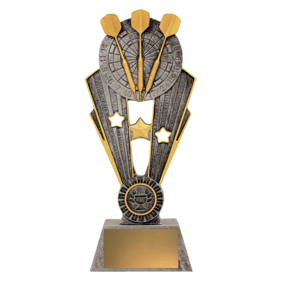Classic Darts trophy series featuring the iconic darts on board design, finished in traditional silver and gold colours. Ideal for players of all ages, Darts trophies available in 3 convenient sizes, with the space for a 25mm club logo if required.