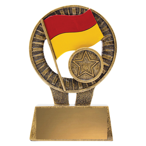 Charming theme trophy for lifesaving and nippers. Affordable option includes space for custom logo.