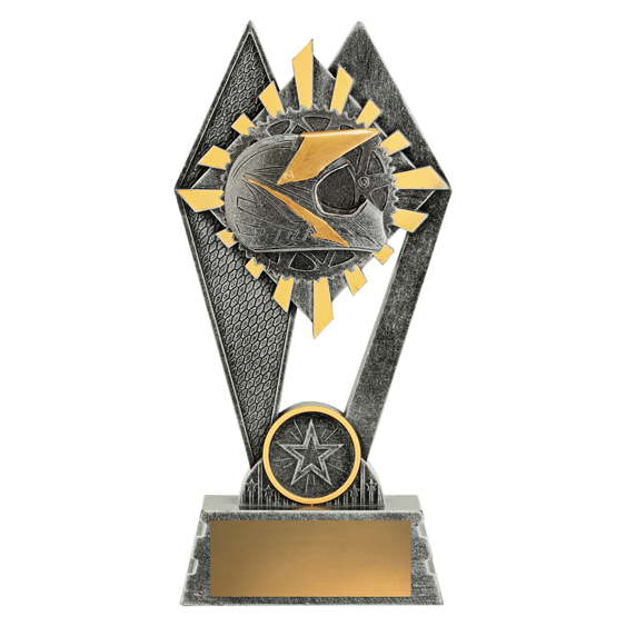 The Peak Series is an innovative set of trophies offering super value for such an impressive size range. An elevated design that showcases the distinct Motocross helmet against vibrant sunray background. Available in 3 sizes.