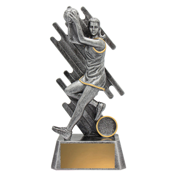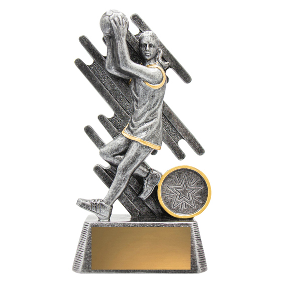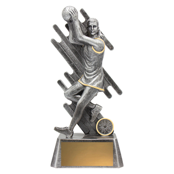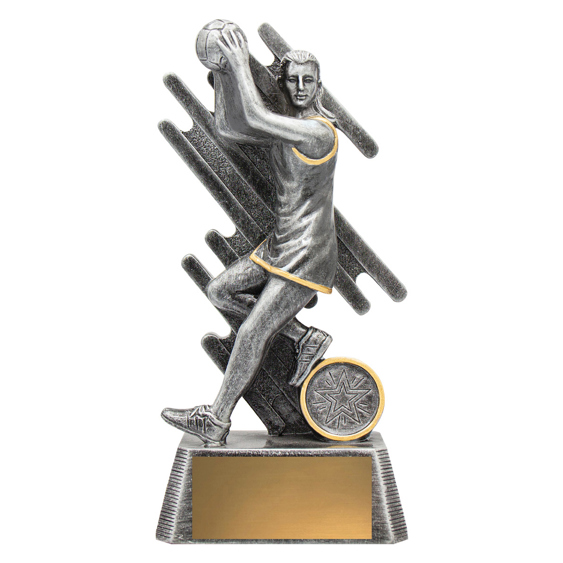 Zoom Series showcases Netball player in action against a stylised backdrop and finished in classic antique silver. Available in multiple sizes and includes space for custom logo.