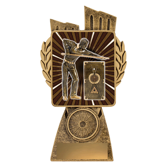 This Antique Gold Lynx Trophy is the perfect theme award for Snooker / Pool events. Featuring a classic wreath and vibrant design, trophies are customisable and available in 4 impressive sizes.