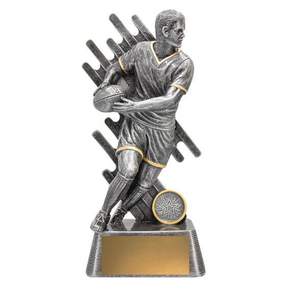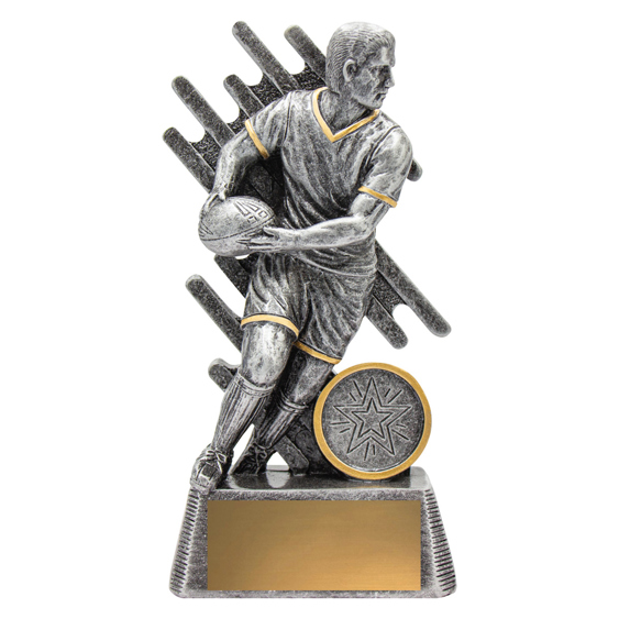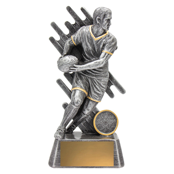 Zoom Series showcases Rugby League or Union player in action against a stylised backdrop and finished in classic antique silver. Available in multiple sizes and includes space for custom logo.