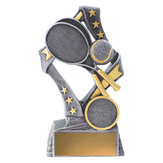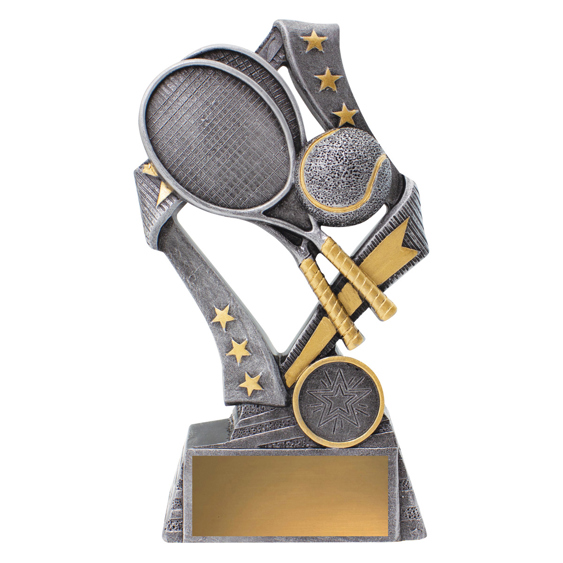 Dynamic tennis trophies perfect for male and female participants at your event. These 'Flag' tennis trophies feature a stylish star based design with iconic racquet and ball elements.